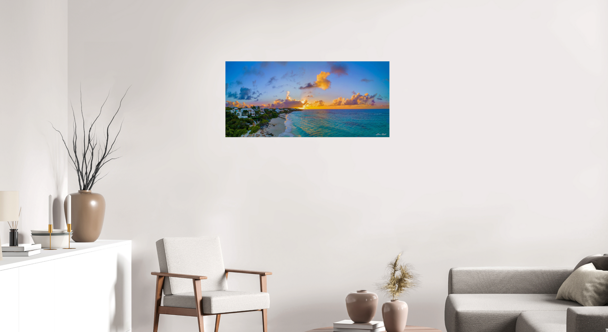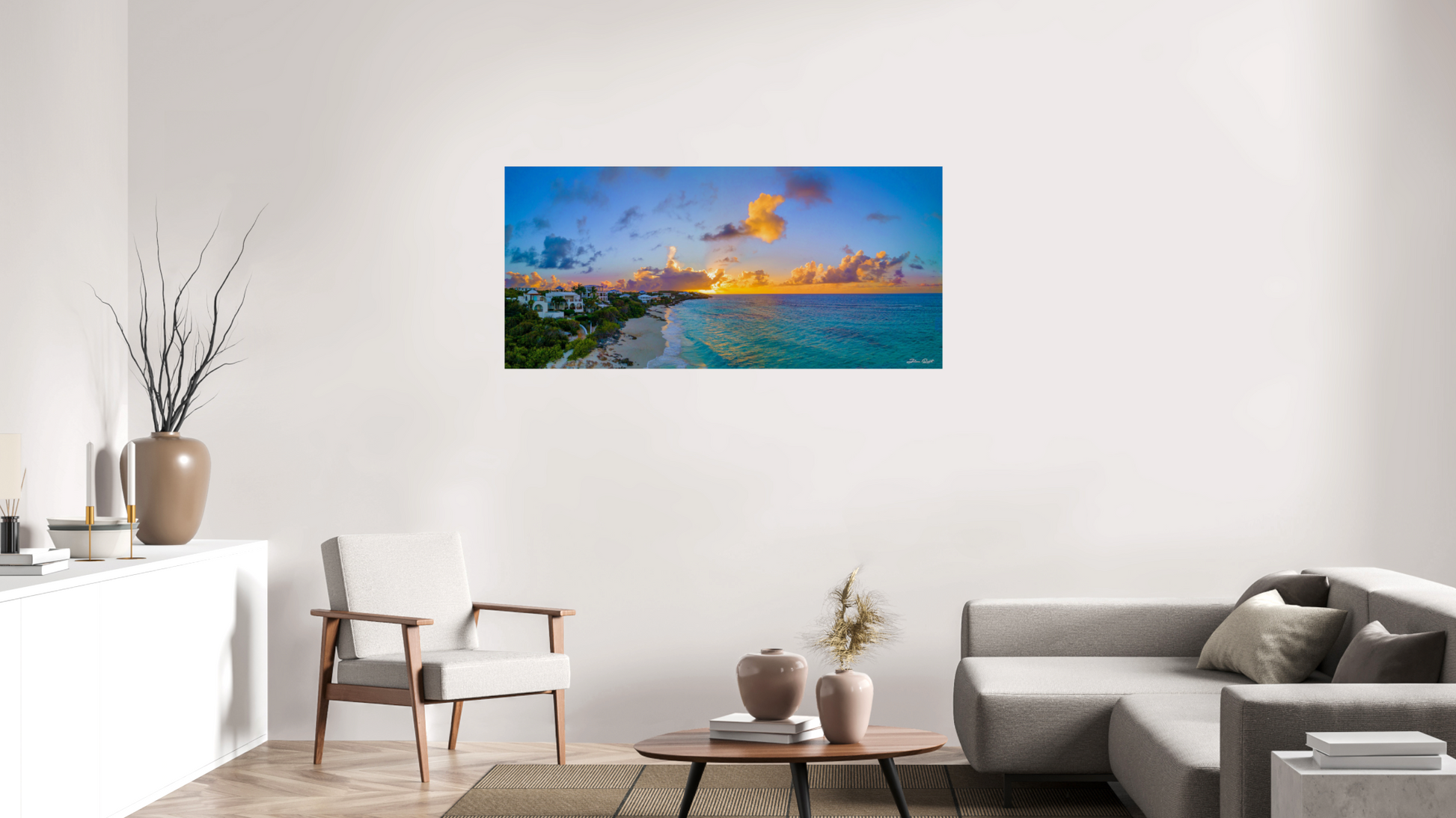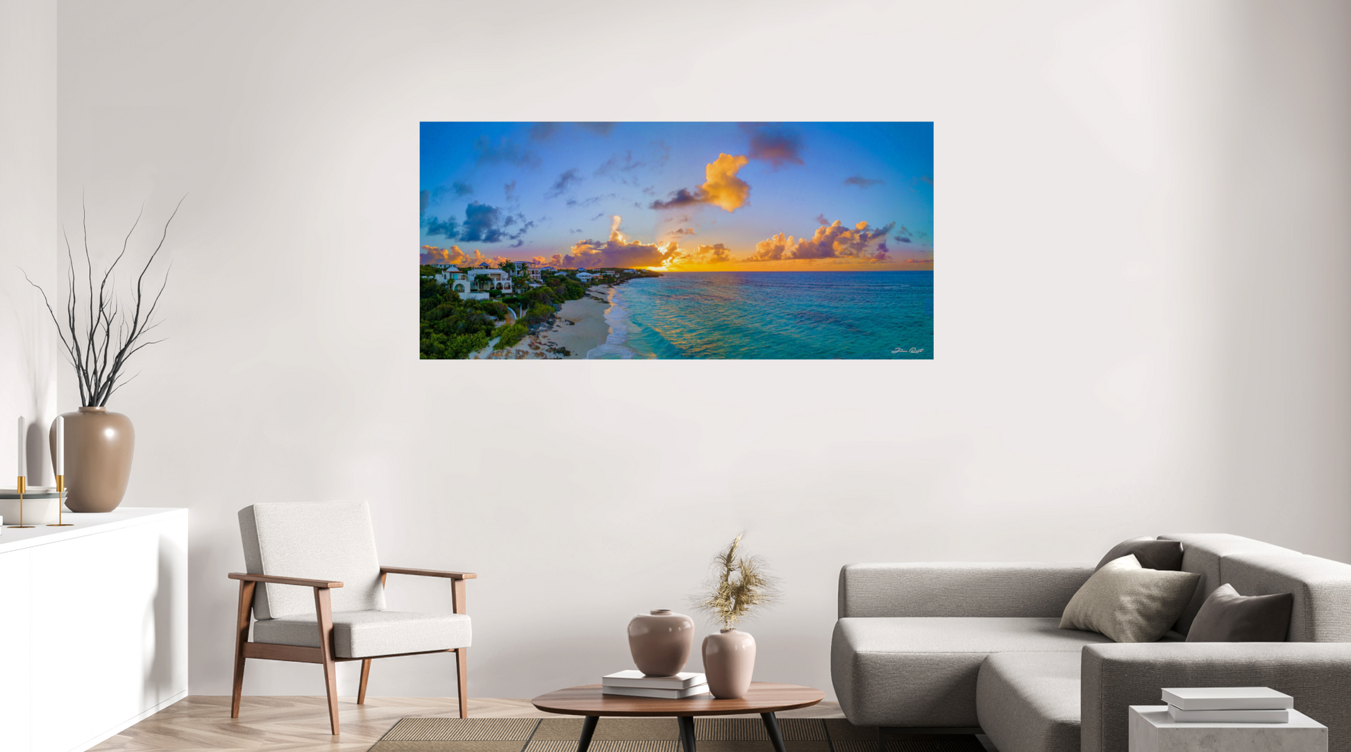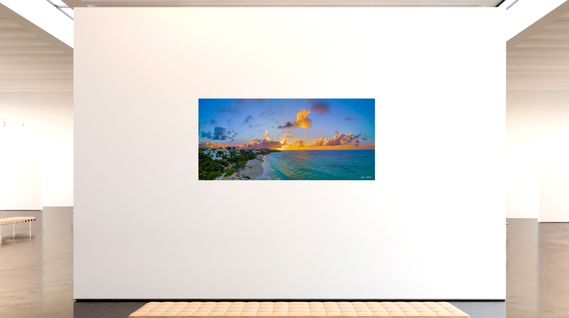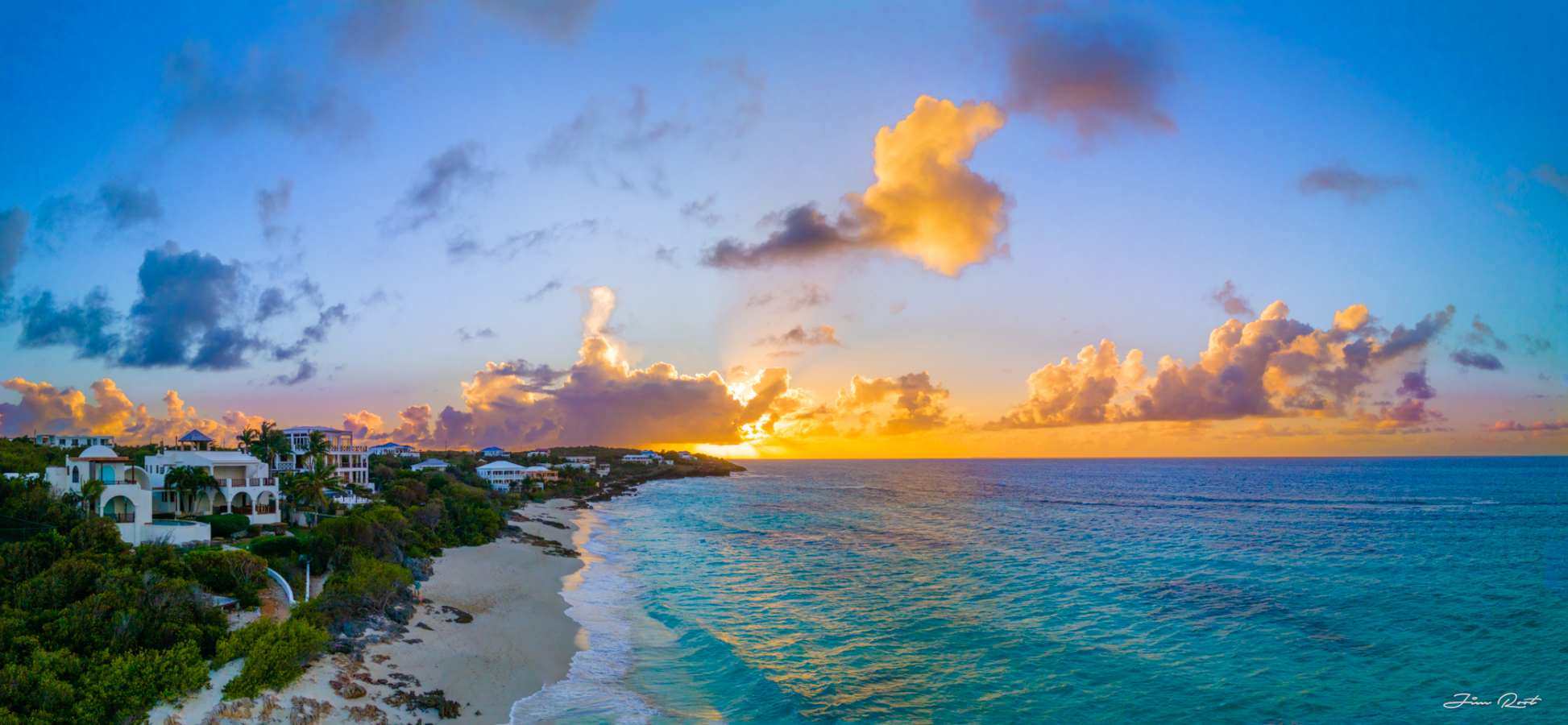This miraculous sunset was taken steps away from Zemi Beach House, the beautiful resort and hotel located in Shoal Bay, Anguilla. Shoal Bay is regarded as one of the most beautiful beaches in the world. This is a beautiful place to watch a sunset with a drink and a beverage, or to stroll along the beach holding hands. You'll find some live music along the way to compliment the rolling waves of Shoal Bay. One of the most romantic moments in this piece is the solitary fisherman casting into the ocean. I watched him cast for hours without a bite, but he never gave up and succeeded just as I captured this photo.